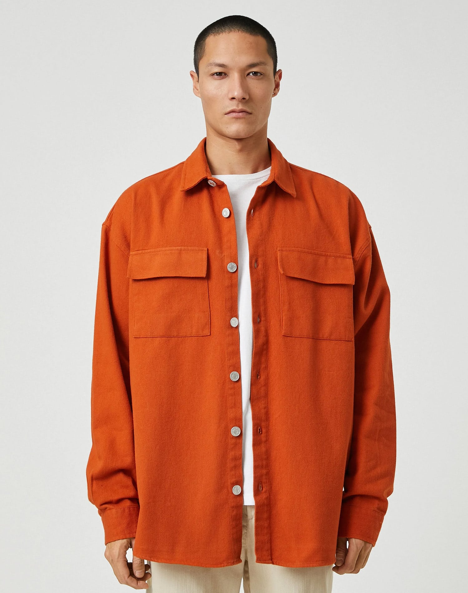 Koton เสื้อเชิ้ตแจ็คเก็ตแขนยาวสำหรับผู้ชาย ผ้าแคนวาส คอปก กระดุมหน้า มีกระเป๋า – สีดำ